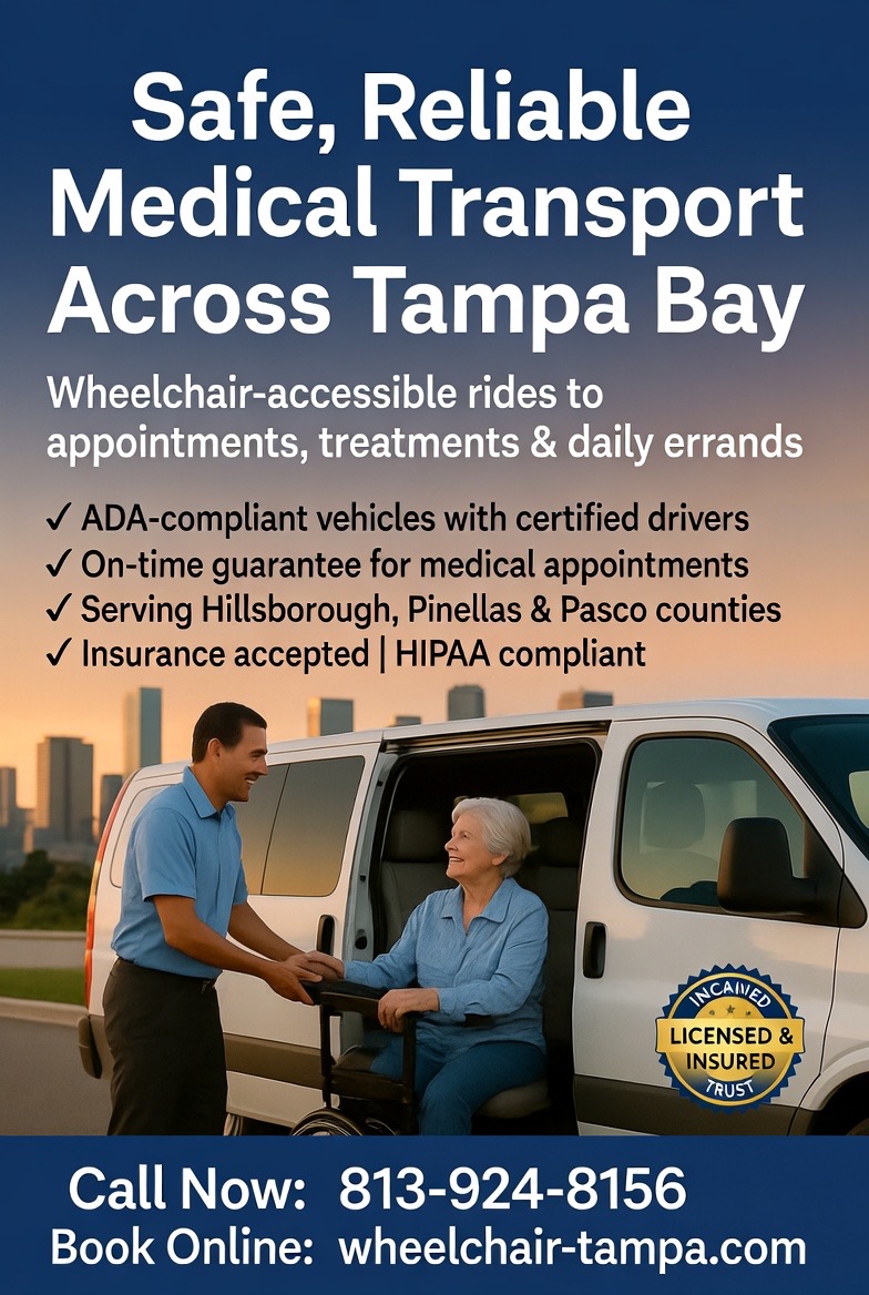 Wheelchair & Stretcher Transportation Services provides non-emergency medical transportation across Tampa and surrounding areas, specializing in wheelchair transport, stretcher transport, hospital discharges, skilled nursing facility transfers, hospice transport, and post-surgical appointments.
