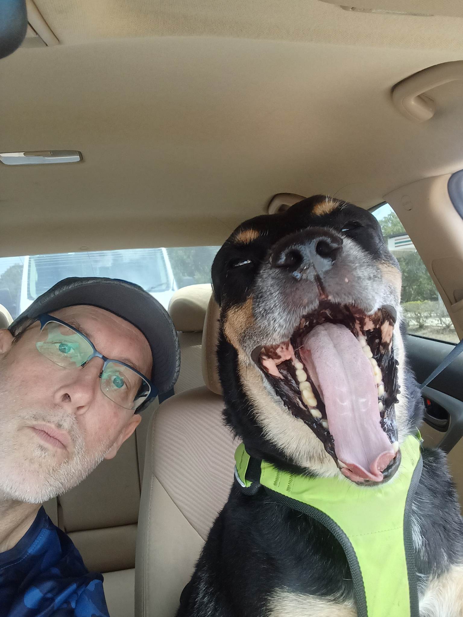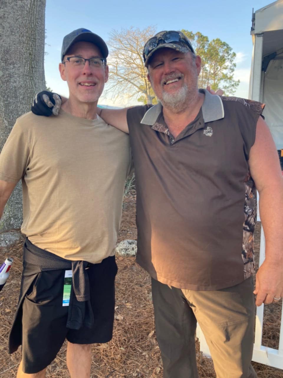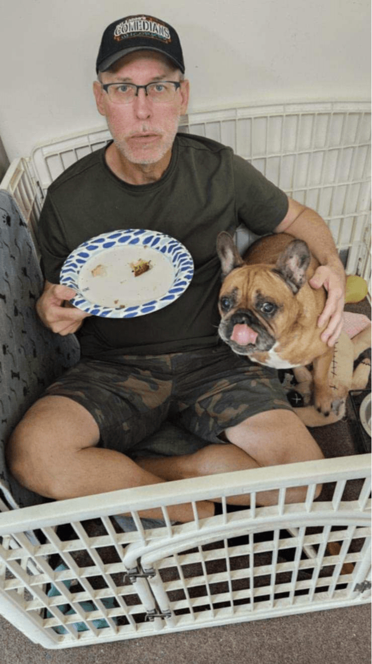 Sir Baxter. He is my Rottie-lab. Xylo, the French Bulldog having lunch with me in his pen. My friend Larry The Cable Guy with me at a golf tournament he was playing in.