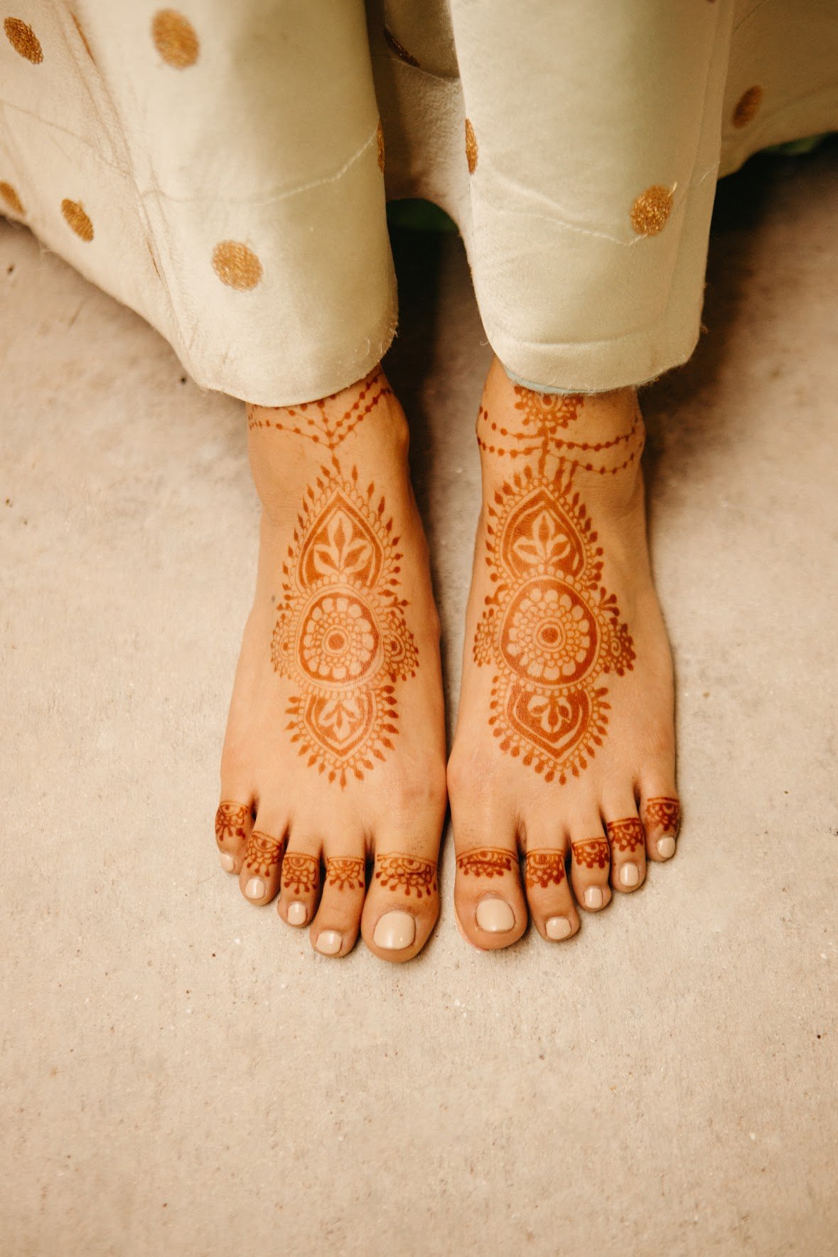 I feel most at peace when I’m quietly creating—late morning light, a cup of chai beside me, my music low, and a fresh cone of organic henna in my hand. There’s something meditative about the rhythm of drawing tiny dots and sweeping lines; time slows, my thoughts settle, and the world narrows to the care I’m putting into each design. I also find deep calm after an event, when a nervous bride or excited child looks in the mirror and smiles—knowing I helped make a memory brings a quiet, grateful stillness that stays with me long after the henna fades.